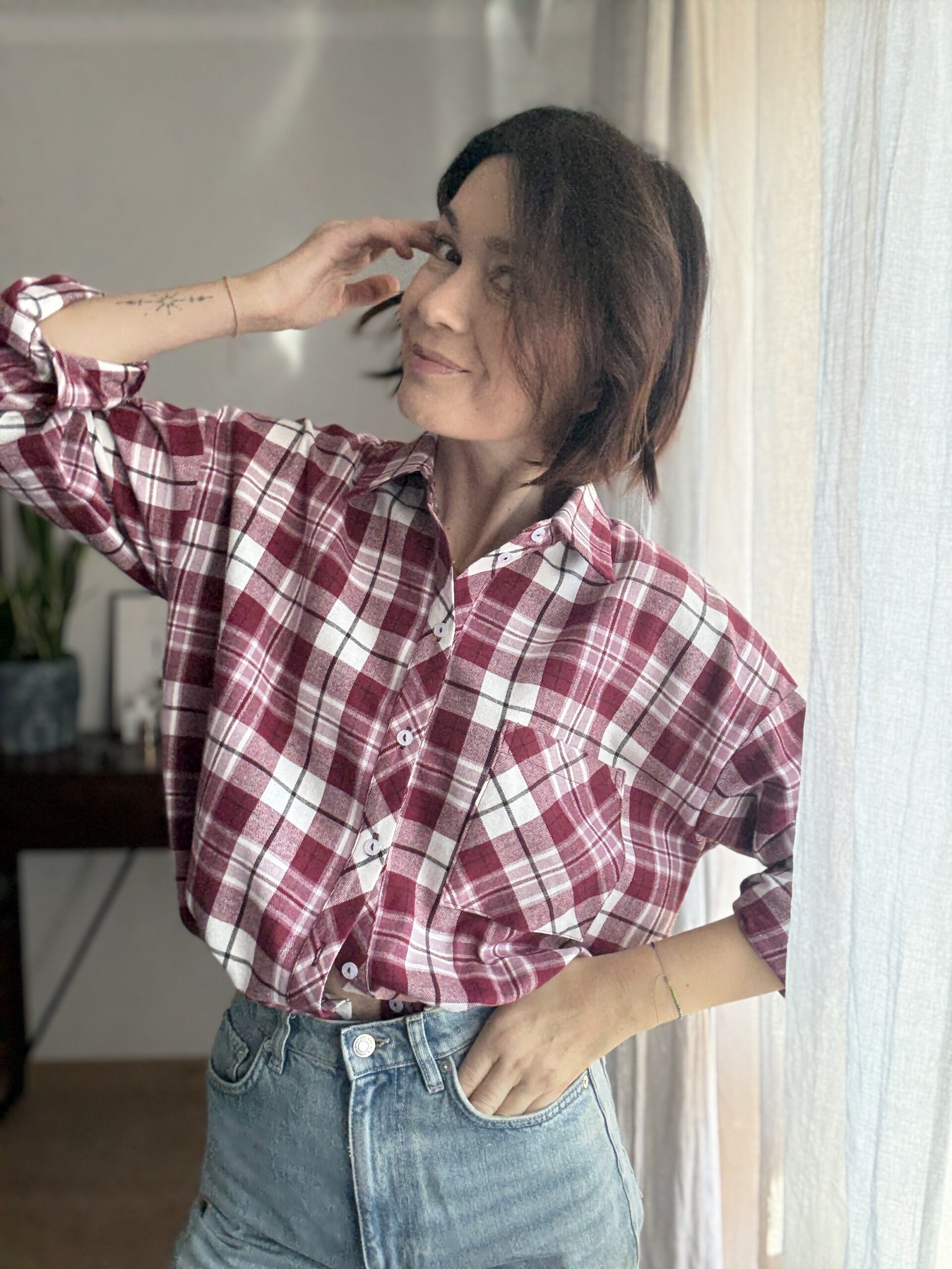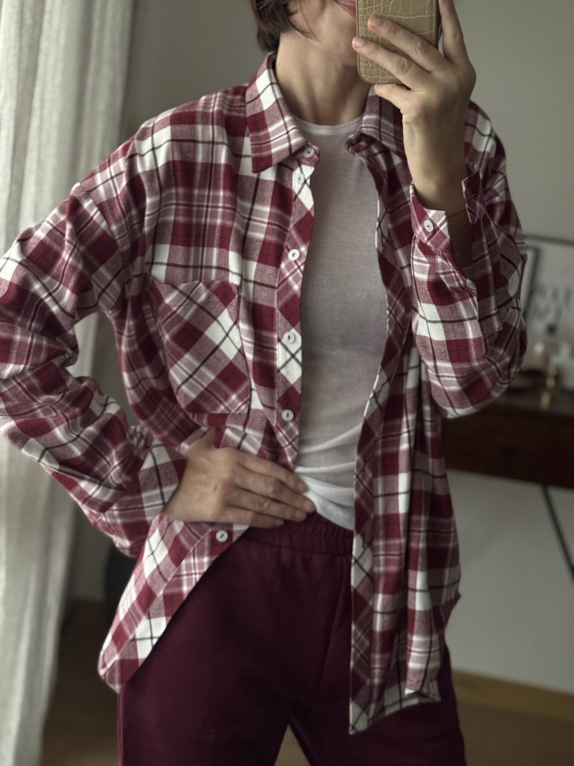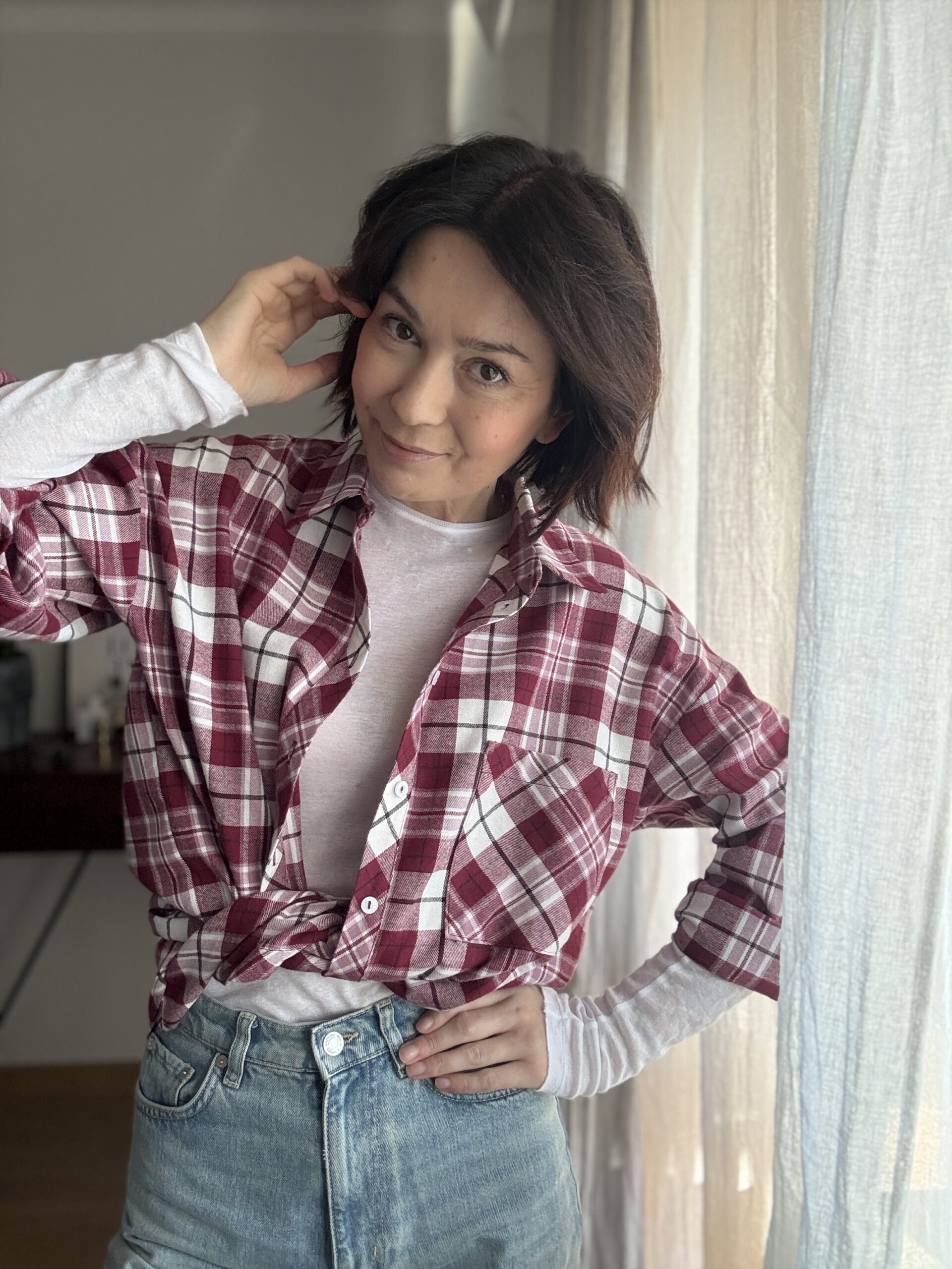 Magda ma 170 cm wzrostu i ma na sobie koszulę w rozmiarze 34/36.