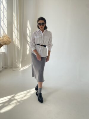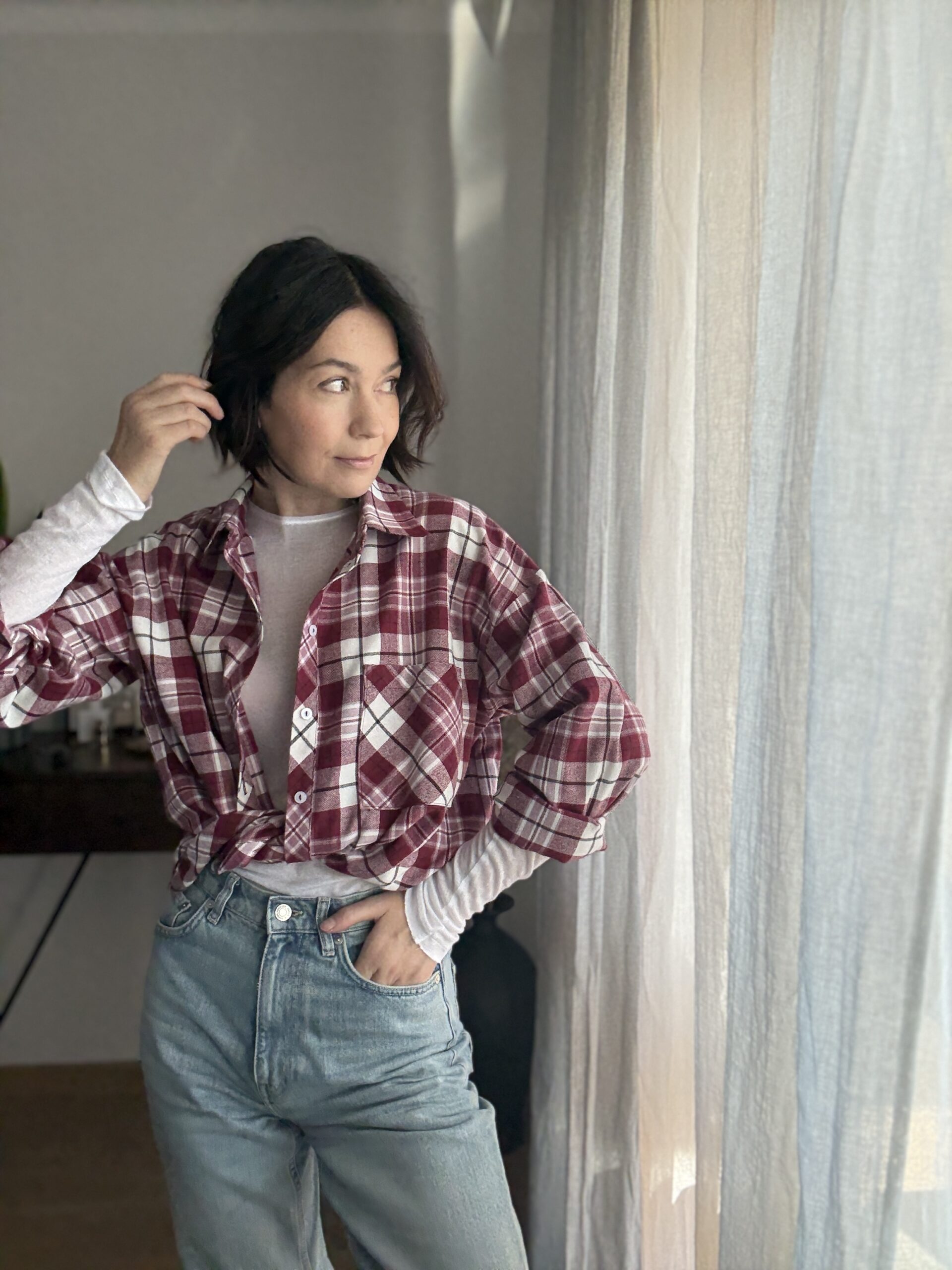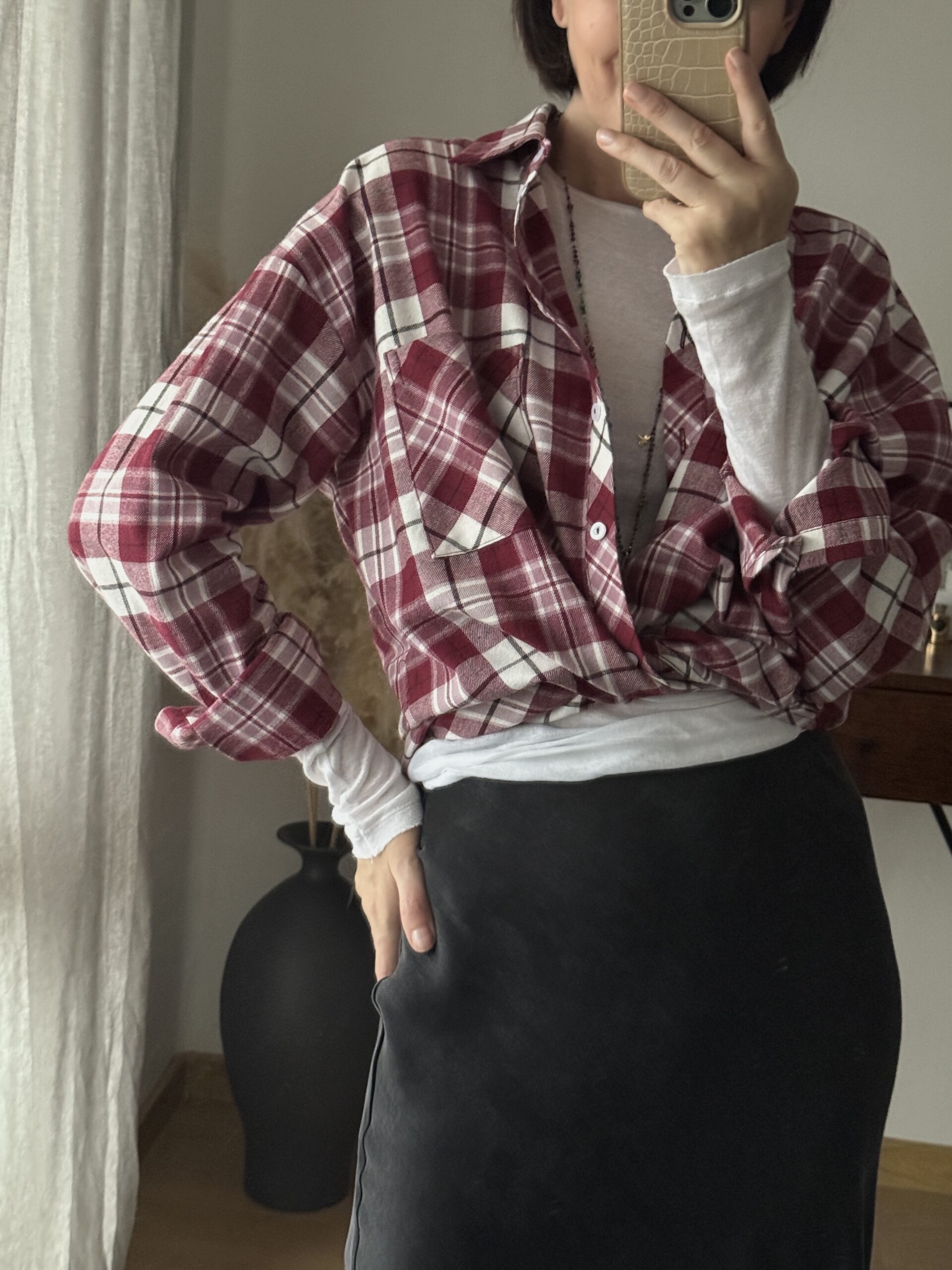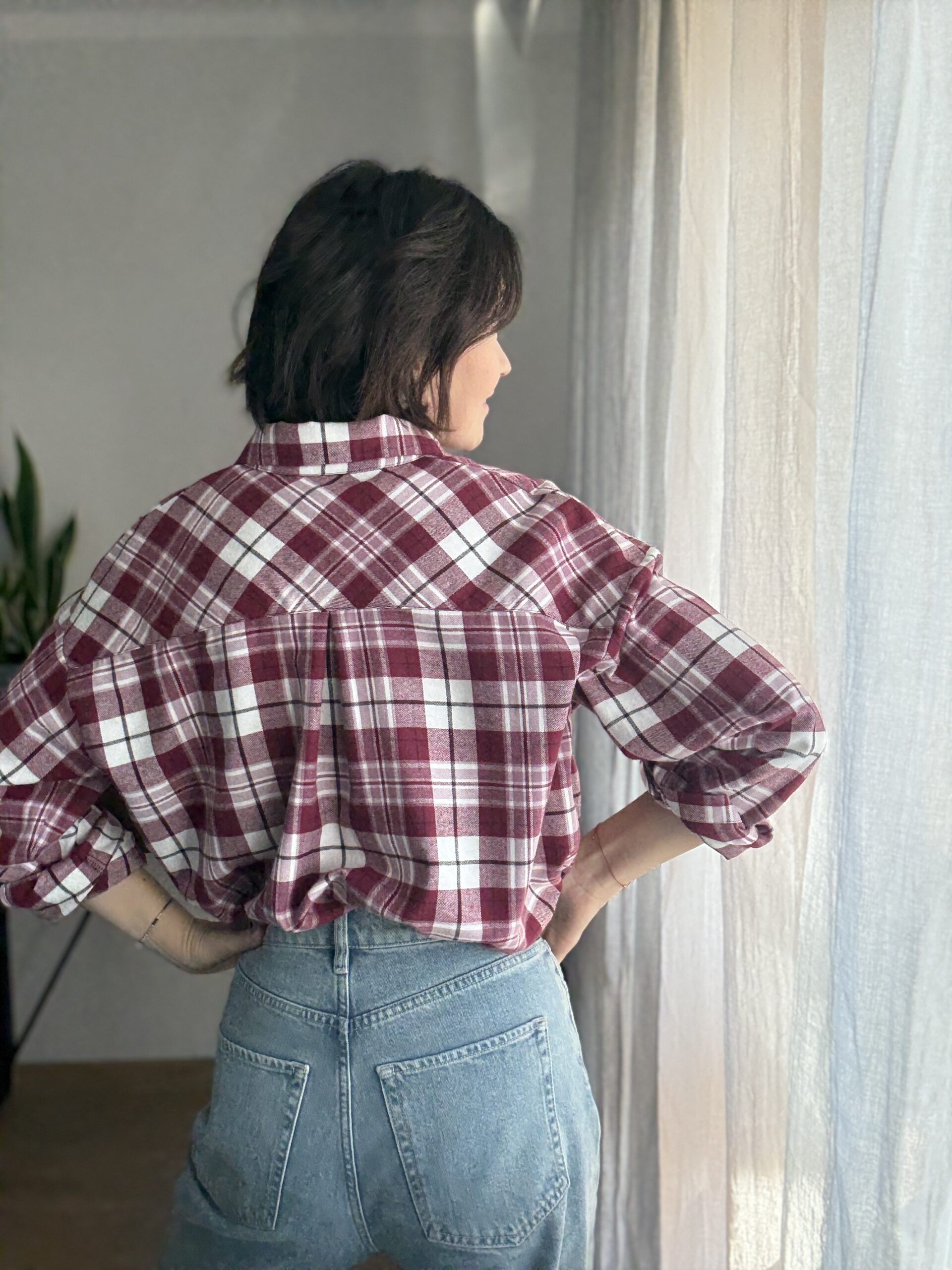 Magda ma 170 cm wzrostu i ma na sobie koszulę w rozmiarze 34/36.