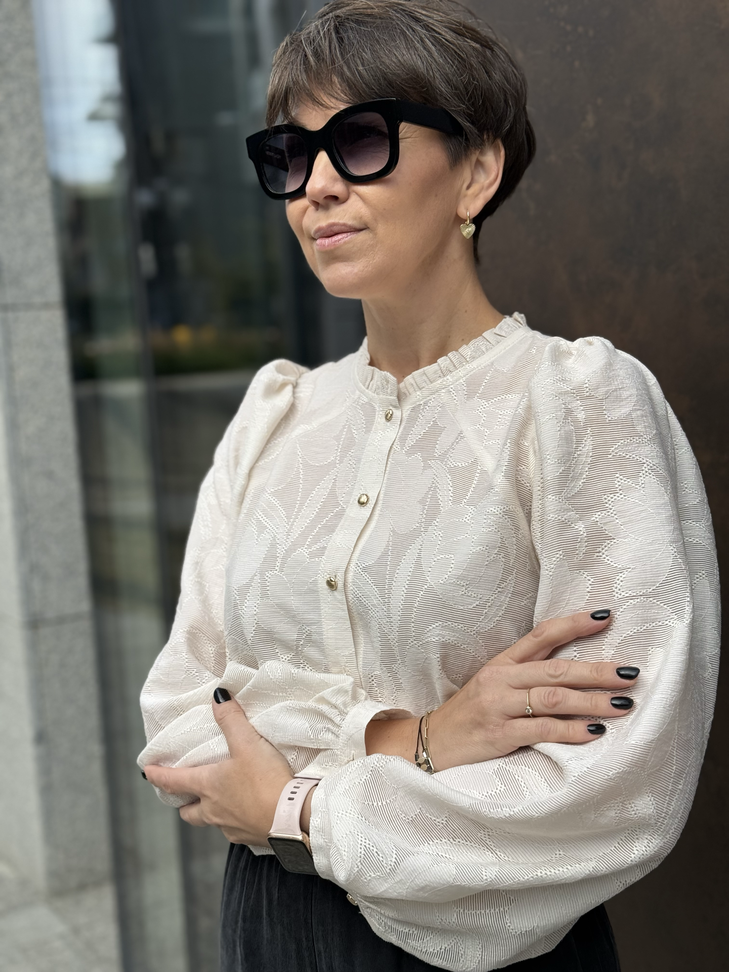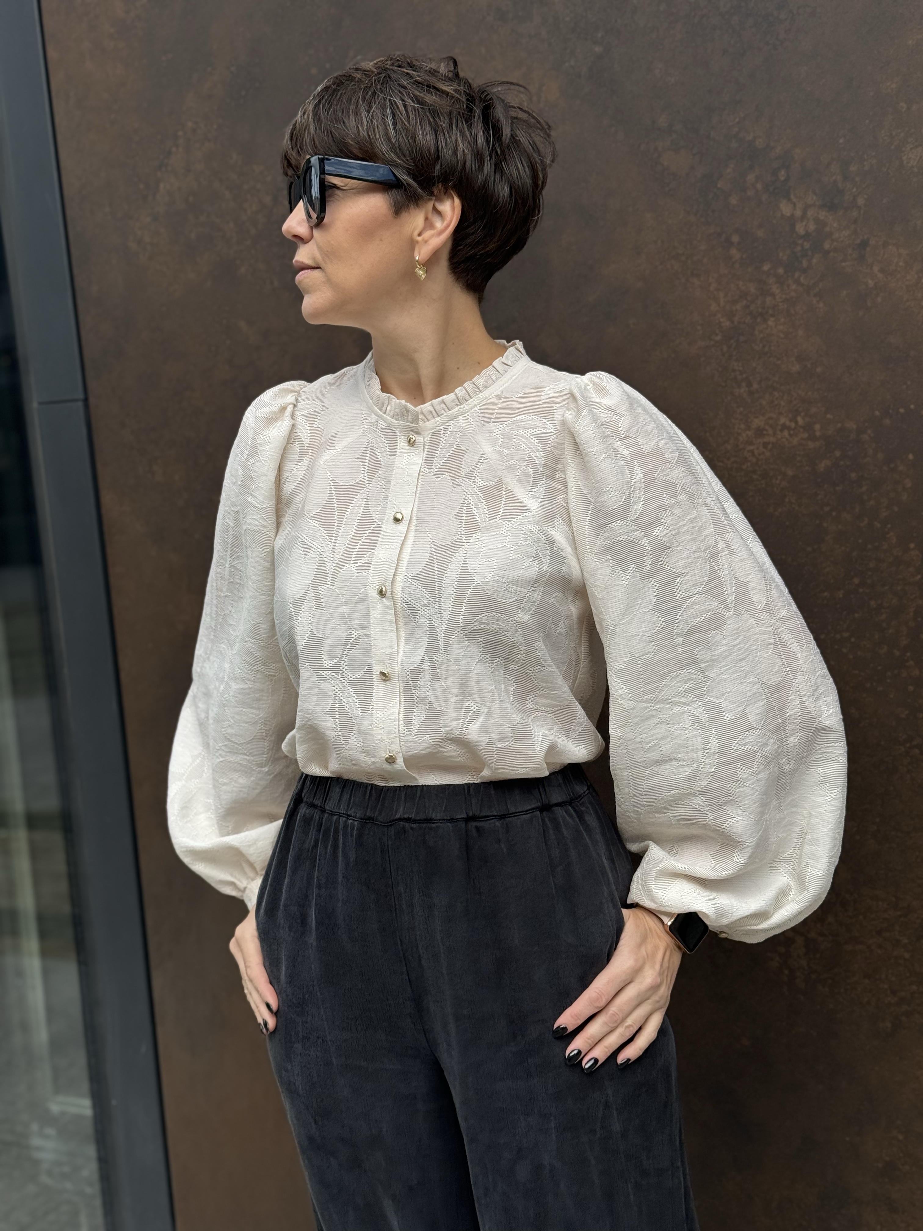 Szerokie, marszczone rękawy sprawiają, że niby niezwykła bluzka robi wrażenie.