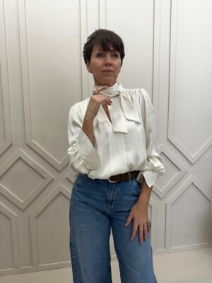Sylwia ma 168 cm wzrostu i ma na sobie bluzkę w rozmiarze 34/36.