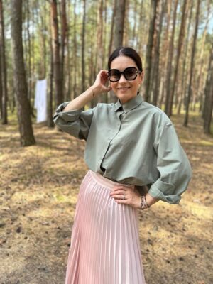 Sylwia ma 168 cm wzrostu i ma na sobie koszulę w rozmiarze 34/36.