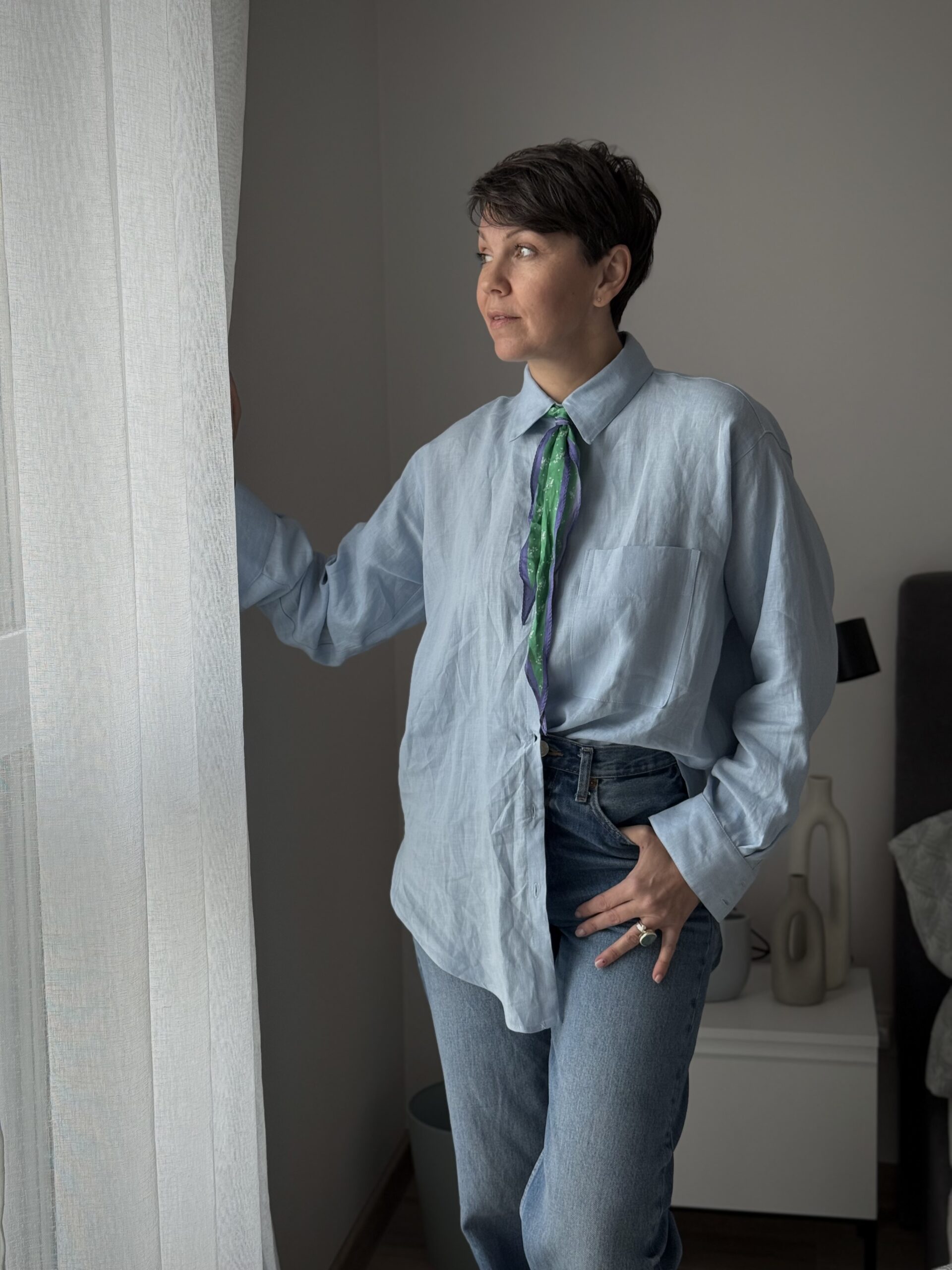 Sylwia ma 168 cm wzrostu i ma na sobie koszulę w rozmiarze 34/36.