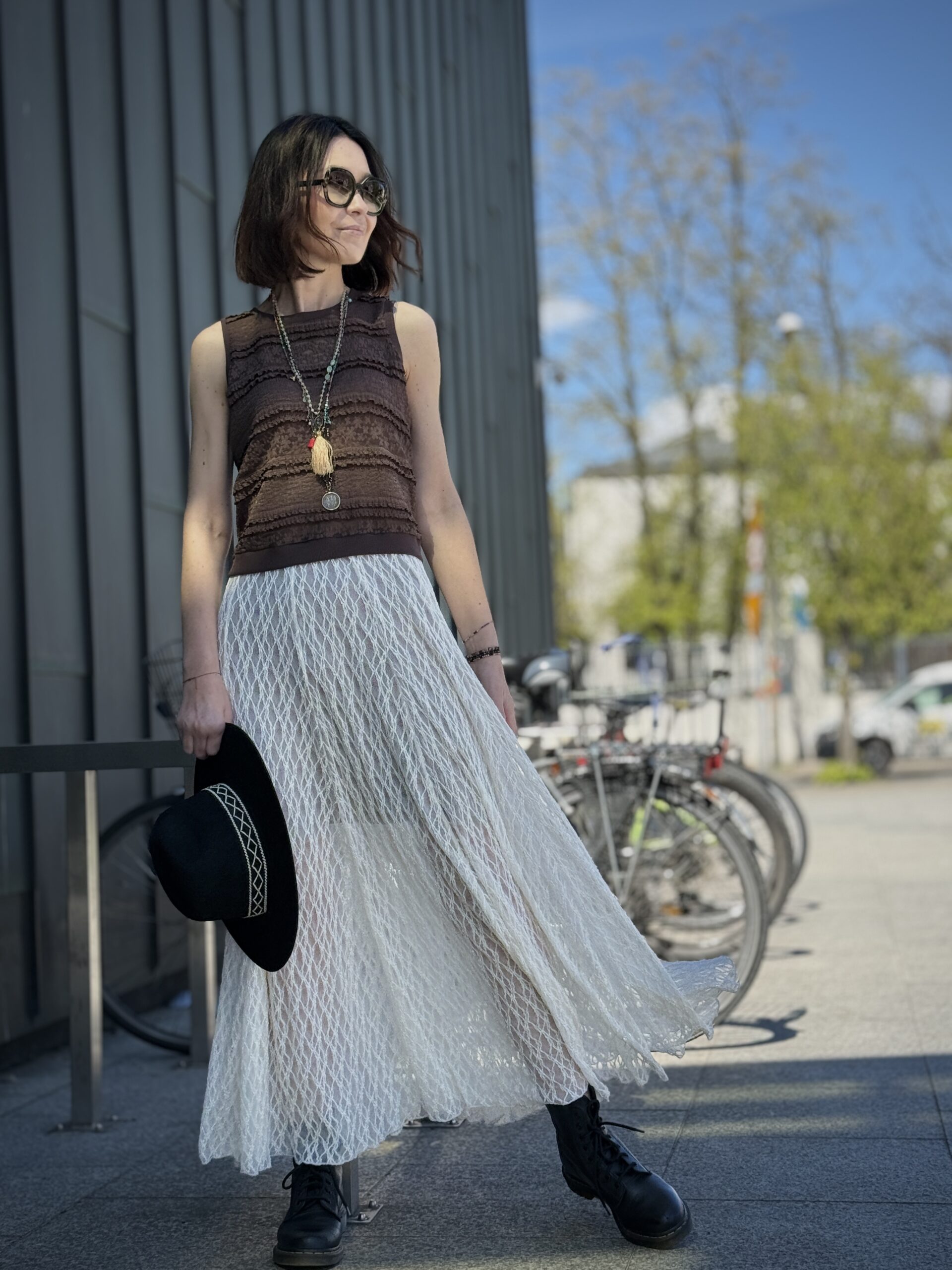 - w połączeniu z cielista halką lub spódnicą Rossa (mini lub midi czy maxi) w kolorze ecru tworzy elegancką, bardziej zakrytą stylizację