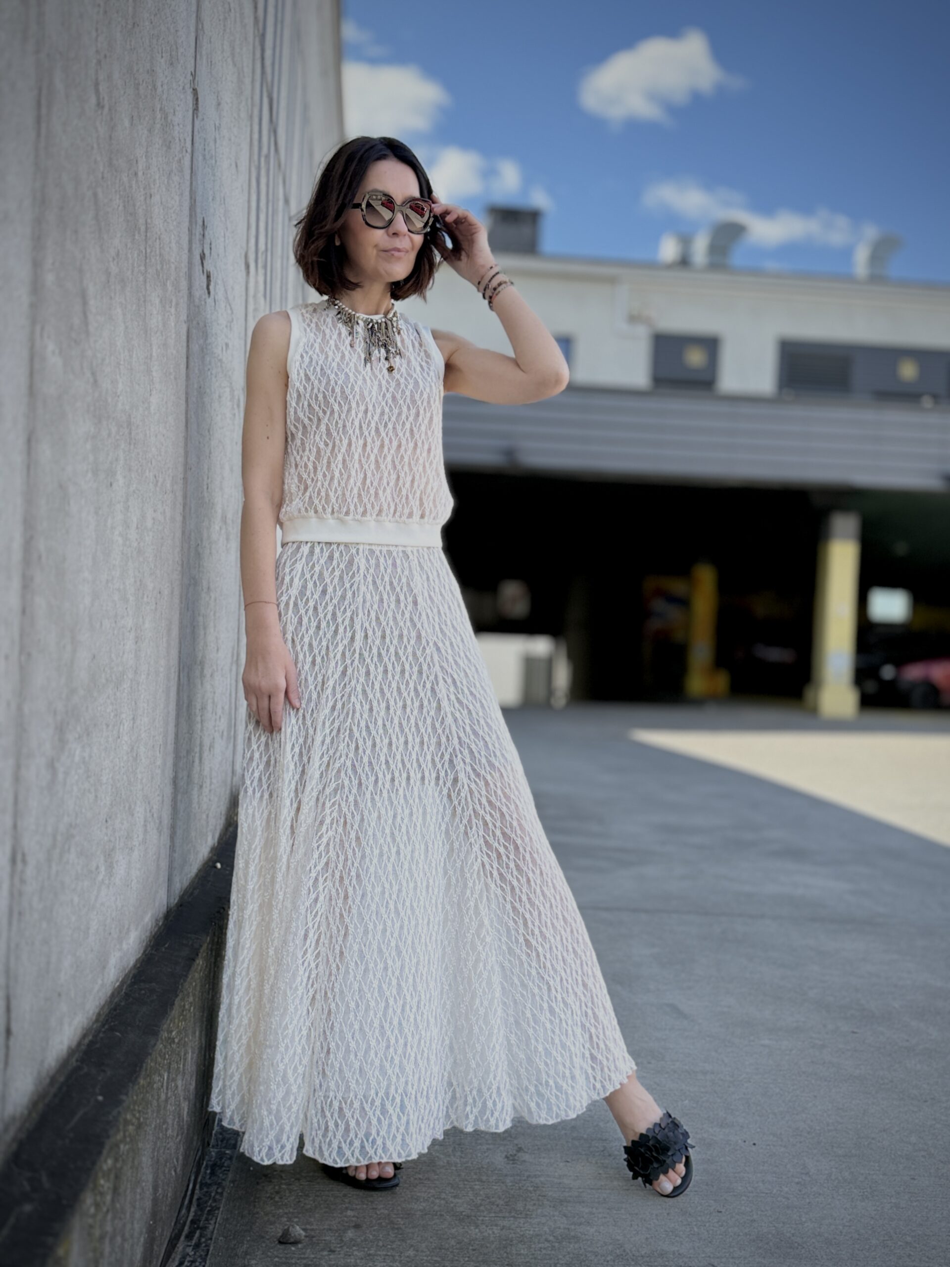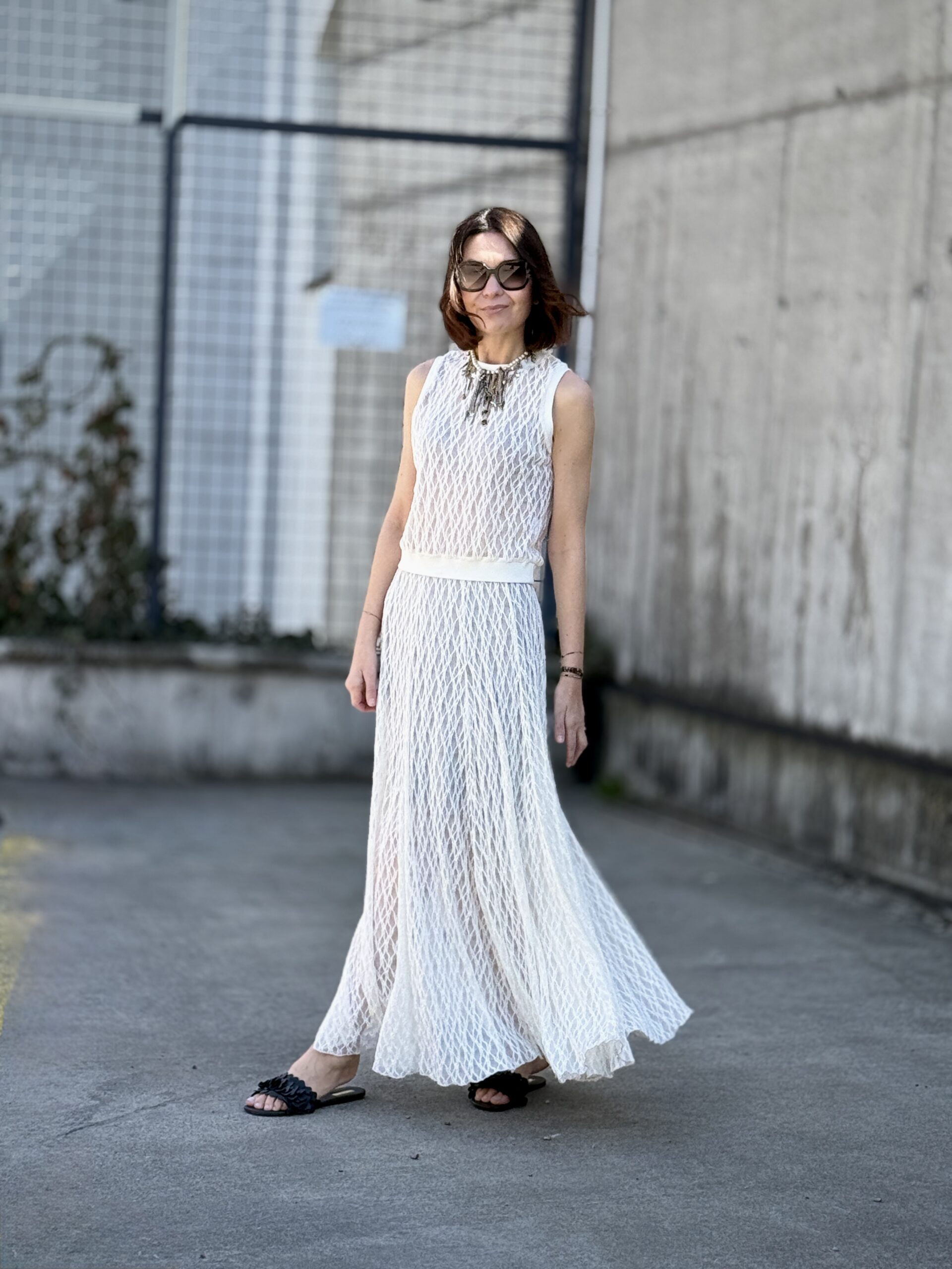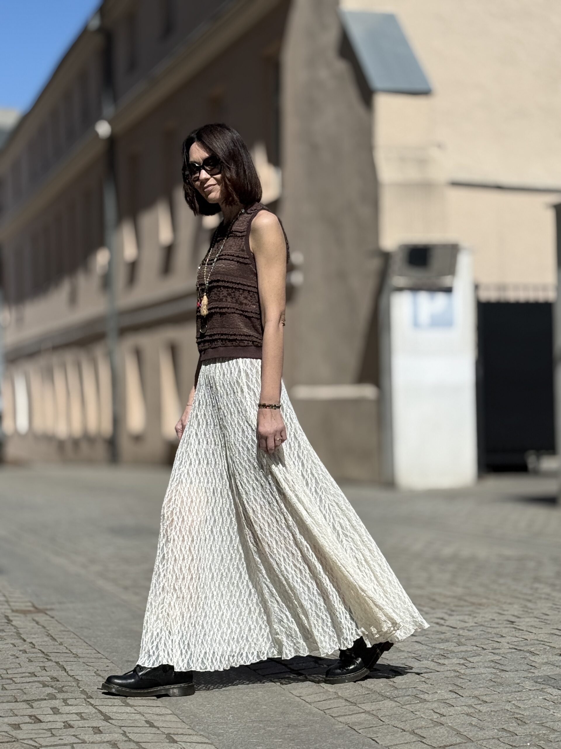 To piękna, rozkloszowana spódnica maxi uszyta z elastycznej, strukturalnej dzianiny koronkowej o subtelnym, geometrycznym wzorze przypominającym romby.